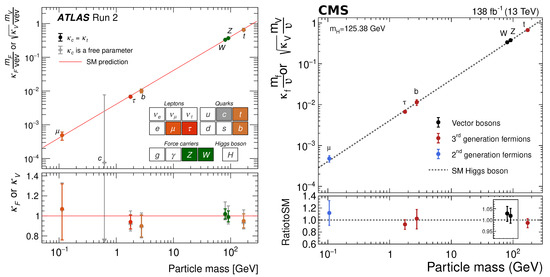 Relationships between couplings and fermion/vector boson masses by (left) ATLAS [11] and (right) CMS [12] experiments. Reproduced under the copyright permission from Springer Nature.