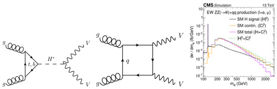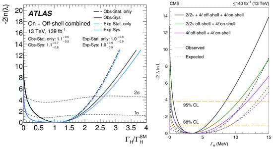 The width of the Higgs boson can be measured using the production mode and subsequent decay, including virtual Higgs boson contributions and its interference [13]. The two sensitive processes are and , with or . Figure 10 shows Feynman diagrams of () production and the simulated differential cross-section as a function of the four-lepton invariant mass [13]. The contribution of the Higgs boson allows determing the Higgs boson width. The ATLAS experiment indirect limit on the width measurement is MeV, with an observed upper limit of 10.5 MeV, for an expected value of 10.9 MeV at 95% CL [14] and MeV for the CMS [13] experiment. Both measurements are in good agreement with the SM prediction MeV [8]. The corresponding likelihood is shown in Figure 11 [13,14], assuming no new particles enter in the production of the virtual Higgs boson.