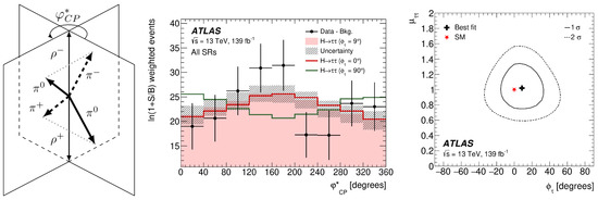 A study of the properties of the interaction between the Higgs boson and tau-leptons (s) was performed, based on the reconstruction of the planes of tau decay products. The results of the observed signal strength versus the -mixing angle are shown in Figure 12, right [15]. No indication of a non-SM contribution is observed. To clarify, Figure 12, left, presents the definition of the angle and Figure 12, middle, shows the data and simulation distribution. The Lagrangian defining and reads [15], and is the ratio of the signal strength to the SM expectation.