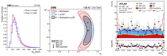 The structure of the Higgs boson top quark Yukawa coupling was also measured in and production [16]. The parameters (-even) and (-odd) are used, and other parameters are fixed to their SM values. Figure 13, left, compares the distributions of the invariant mass for the pure -even and -odd assumptions and Figure 13, middle, and Table 3 show the results of the measured and values [16].