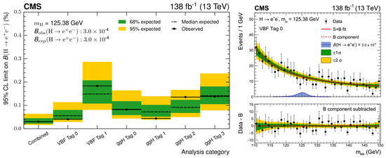 - The CMS Collaboration. Search for the Higgs boson decay to a pair of electrons in proton–proton collisions at = 13 TeV. Phys. Lett. B 2023, 846, 137783. [Google Scholar] [CrossRef]