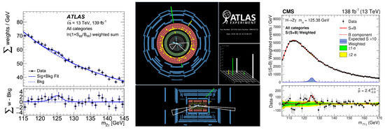 The SM Higgs boson decay modes are within experimental reach. The ATLAS Collaboration obtains a significance of 2.2 (1.2 exp.) standard deviation (s.d.), and the best-fit value for the signal yield normalized to the SM prediction is [20], while the CMS Collaboration obtains a significance of 2.7 (1.2 exp.) s.d. and [21], where the statistical component of the uncertainty is dominant. Figure 15 shows the distribution from ATLAS [20] (Figure 15, left) and CMS [21] (Figure 15, right) experiments, as well as an event display of an ATLAS experiment candidate event (Figure 15, middle). A combination of the data from the ATLAS and CMS Collaborations leads to a 3.4 (1.6 exp.) s.d. evidence with [22] (Figure 16, left).
