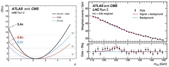Left: negative profile log-likelihood test statistic as a function of the signal strength [22], where denotes standard deviation. Right: ATLAS and CMS experiments invariant mass distribution [22]. Reproduced under the copyright permission from the American Physical Society.