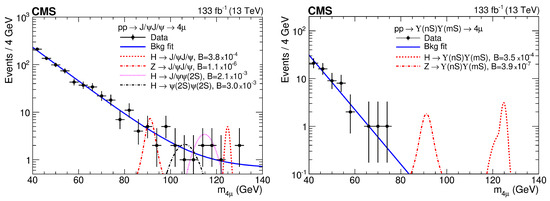 Left: four-muon invariant mass for searches. The limits are given for different assumptions on the polarization of the intermediate particles. The signal distributions are shown for branching ratios at the observed limit [23]. Right: four-muon invariant mass for searches [23]. Reproduced under the copyright permission from Elsevier.