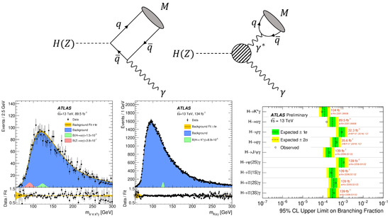 Upper: Feynman diagrams for the associated production of a meson and a photon in Higgs boson decays [24]. Lower: invariant masses of mesons and photons (left and middle) [24] and ATLAS public summary of the limits (right) [25]. Reproduced under the copyright permission from Elsevier (upper, lower left and middle) and under the CC-BY-4.0 license (lower right).