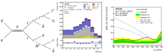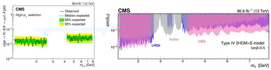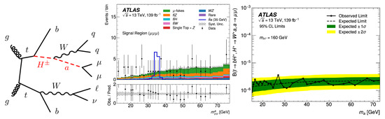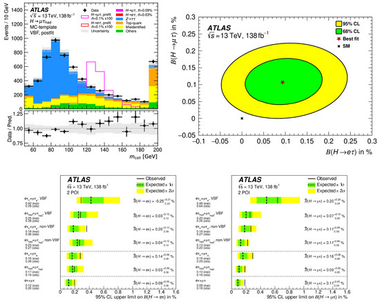 Searches for LFV processes led to limits on the Higgs boson branching fractions BR exp.) and BR exp.) at 95% CL. No measurement is compatible with LFV. Figure 19, upper left, shows an observed invariant-mass distribution along with the simulated BR and BR signals, which were observed and, in the SM, expected to be BR and BR results (Figure 19, upper right). Figure 19, lower, shows limits on these branching ratios set at 95% CL [26]. CMS experiment searches for LFV processes led to branching ratio limits 4.4 (4.7 exp.) × 10−5 at 95% CL [27]. An excess of events over the expected background is observed at an electron–muon invariant mass of approximately 146 GeV with a global (local) significance of 2.8 (3.8) s.d. Figure 20, left, shows the -invariant-mass distribution and Figure 20, middle, shows the resulting limits on the Higgs boson branching fractions at 95% CL [27]. The ATLAS Collaboration observed no significant signal, in agreement with the SM expectation (Figure 20, right) [28].