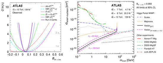 Left: twice the negative logarithmic profile likelihood ratio as a function of BR decays into invisible particles [30]. Right: upper limits on the interaction cross-section of WIMP dark matter candidates with nucleons [30]. Reproduced under the copyright permission from Elsevier.