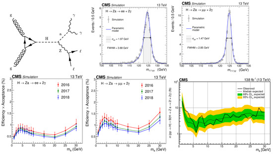 An elegant solution to the strong problem by Roberto Peccei and Helen Quinn [35] is the introduction of a spontaneously broken U(1) symmetry leading to new light pseudoscalar particles—the axions—that couple very weakly to photons. At LHC, a search for the production of axion-like pseudoscalar particles in the decay with , where and , is reported. Figure 24 shows simulated and signals (Figure 24, upper middle and upper right), efficiency times acceptance (Figure 24, lower left and lower middle), and limits on the Higgs boson decay branching fraction (Figure 24, lower right). Limits on models involving axion-like particles, formulated as an effective field theory, were also reported in Ref. [36].