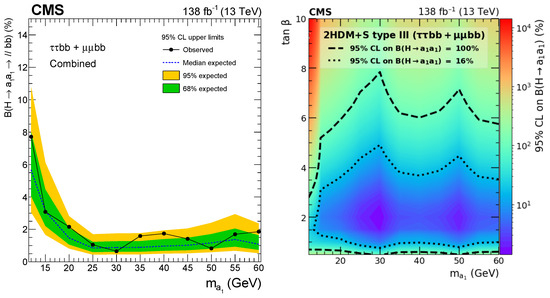 - CMS Collaboration. Search for exotic decays of the Higgs boson to a pair of pseudoscalars in the μμbb and ττbb final states. Eur. Phys. J. C 2024, 84, 493. [Google Scholar] [CrossRef]