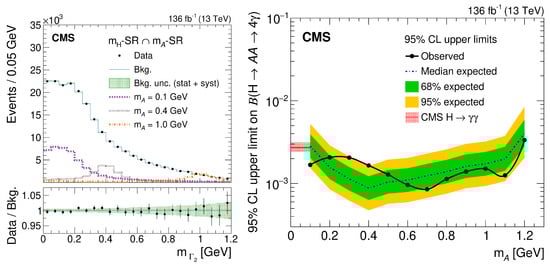 - Tumasyan, A. et al. [CMS Collaboration] Search for exotic Higgs boson decays H→AA→4γ with events containing two merged diphotons in proton–proton collisions at = 13 TeV. Phys. Rev. Lett. 2023, 131, 101801. [Google Scholar] [CrossRef] [PubMed]