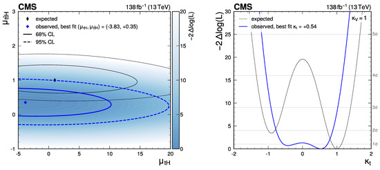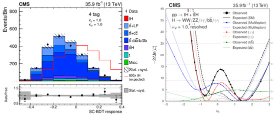 - The CMS Collaboration. Measurement of the tH and tH production rates in the H→b decay channel using proton–proton collision data at = 13 TeV. arXiv 2024, arXiv:2407.10896. [CrossRef]