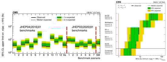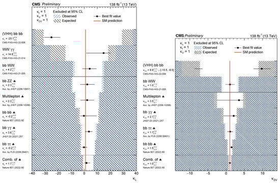 - CMS Collaboration. Higgs PAG Summary Plots. Summary of Run-2 κλ and κ2V measurements from HH production. Available online: https://twiki.cern.ch/twiki/bin/view/CMSPublic/SummaryResultsHIG (accessed on 30 May 2024).