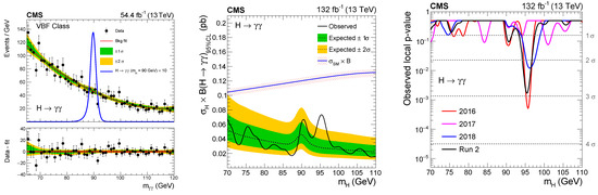 - The CMS Collaboration. Search for a standard model-like Higgs boson in the mass range between 70 and 110 GeV in the diphoton final state in proton–proton collisions at = 13 TeV. arXiv 2024, arXiv:2405.18149. [CrossRef]