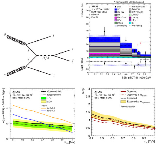 - The ATLAS Collaboration. Search for tH/A→tt production in the multilepton final state in proton–proton collisions at = 13 TeV with the ATLAS detector. J. High Energy Phys. 2023, 2023, 203. [Google Scholar] [CrossRef]