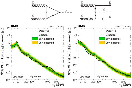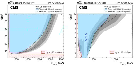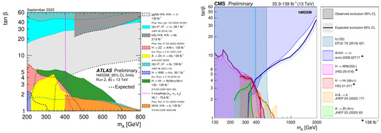 - CMS Collaboration. Higgs PAG Summary Plots. Summary of MSSM Higgs Boson Searches at 13 TeV (Run 2). Available online: https://twiki.cern.ch/twiki/bin/view/CMSPublic/SummaryResultsHIG (accessed on 30 May 2024).