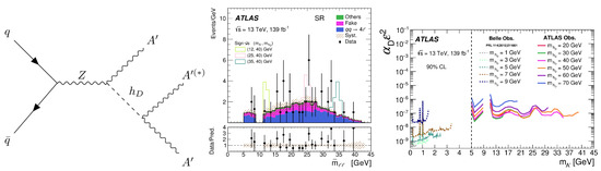Left: dark photon production Feynman diagram. Right: upper limits on the Higgs boson decay branching ratios to [34]. Reproduced under the copyright permission from Springer.