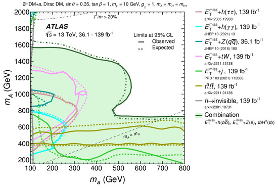 - The ATLAS Collaboration. Combination and summary of ATLAS dark matter searches interpreted in a 2HDM with a pseudo-scalar mediator using 139 fb−1 of = 13 TeV pp collision data. Sci. Bull. 2024; in press. [Google Scholar] [CrossRef]
