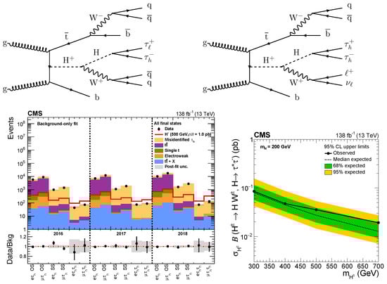 - The CMS Collaboration. Search for a charged Higgs boson decaying into a heavy neutral Higgs boson and a W boson in proton–proton collisions at = 13 TeV. J. High Energy Phys. 2023, 2023, 32. [Google Scholar] [CrossRef]