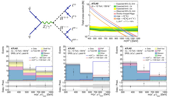 - ATLAS Collaboration. Search for doubly charged Higgs boson production in multi-lepton final states using 139 fb−1 of proton–proton collisions at = 13 TeV with the ATLAS detector. Eur. Phys. J. C 2023, 83, 605. [Google Scholar] [CrossRef]