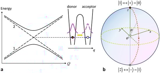 Description of a two-state CT process as a qubit state moving on the Bloch sphere. (a) Energy profile of the CT system as a function of a nuclear reaction coordinate or some other time-dependent parameter (such as the amplitude of an applied electric field in a driven CT system [98]) describing the system along the CT reaction path [1,8,98]. All quantities in the Hamiltonian matrix (25) depend on time through this parameter; e.g., , where is a suitable function of . The dashed lines describe the energies of the diabatic states (that is, the diagonal terms of the Hamiltonian) at varying and hence . The solid lines describe the energies of the adiabatic states, which split near the transition state coordinate, where the diabatic levels cross. Their minimum separation at this coordinate is twice the modulus of the coupling between the diabatic states and . Near the transition state, where the charge transition can more easily occur, the diabatic energy difference is negligible compared to the coupling. The inset shows the potential energy profile seen by the transferring charge (e.g., an electron) along its coordinate , at the transition nuclear coordinate, where the two localized electronic states are degenerate (the corresponding wave functions are schematized in purple). The tunneling probability is determined by the electronic coupling matrix element. (b) A coherent CT process can be seen as a motion of the representative point of the system state on a great circle of the Bloch sphere of the fictitious spin associated with the two-level system through Equation (27). If the charge transition probability reaches unity, the corresponding point on the Bloch sphere moves from the north pole to the south pole (red dashed line).