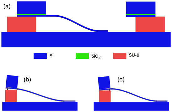 In the ideal case, the two wafers are completely parallel to each other, and the slope of the cantilever at the fixed end is zero. However, the area of contact between the SOI wafer and the separating layer is estimated as 123 mm2 (the exact dimensions of the chip are presented in Ref. [42]). In this large area, it is complicated to exclude a dust particle between the wafers. Such a particle may result in a nonzero slope of the fixed end of the cantilever with respect to the bearing substrate. Given the particle position, the slope can be negative or positive, as shown in Figure 2b,c. This is realized as demonstrated in Ref. [42]. Therefore, one has to modify boundary condition (4) at as follows: