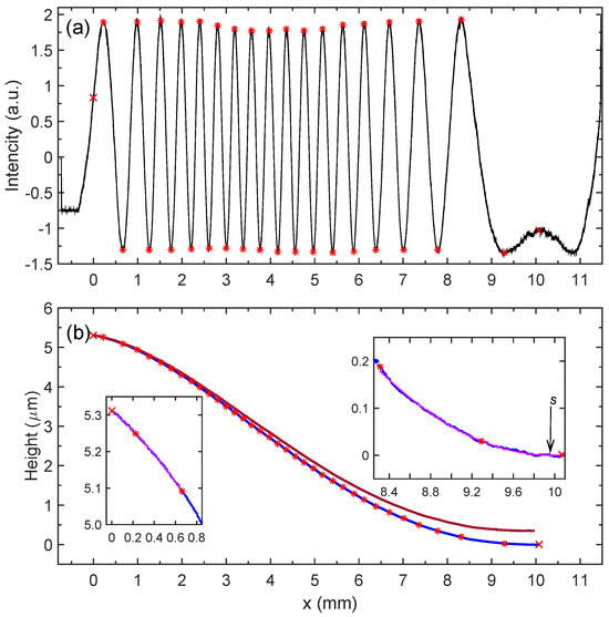 The interferometer signal for the laser beams moving along the left side of the cantilever is shown in Figure 5a. The data between two red crosses are used to determine the shape of the cantilever from the interferogram. The position of the left cross, which is close to the fixed end, is chosen to exclude uncertainties in the signal that appear in the transition region at x close to zero. If one takes the initial point closer to the transition point, the error in the determination of the angle is considerably larger. The right cross indicates the last point taken at the inflection point. The red stars show the extrema of the interferogram. The blue dots in Figure 5b correspond to the height of the cantilever restored from the data in Figure 5a. The restoration is unique because it is known that the function cannot have more than one maximum. The brown dots correspond to the height restored from the data collected from the scanning along the right side of the cantilever. These data correspond to the function . As one can see, the right side is not adhered and hangs above the substrate at a height of , demonstrating the effect of the twisting of the cantilever, where nm.