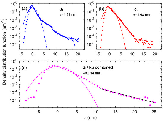 The roughness of the contacting surfaces is essential for the theoretical prediction of the adhesion energy. Although the working surface of the cantilever is the polished side of the SOI wafer, it becomes rough after oxidation with the following etching of the oxide. The substrate is covered by a deposited material, which in this case is ruthenium. The AFM scans of both surfaces have been presented in Ref. [42]. The scanned area was µm2, recorded with a resolution of 1024 pixels per line. For each surface, three scans recorded in different places have been performed. The roughness of both surfaces cannot be described by the normal distribution, as one can see in Figure 7a,b. The deviation is well visible on the logarithmic vertical scale. There are much more high peaks than those predicted by the normal distribution. This effect was already stressed previously for the magnetron [55] deposition of metals on a cold substrate without annealing.