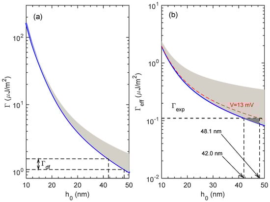 The dark-gray curved triangle in Figure 8b demonstrates the allowed region of the parameters in the (-V) space. The red dashed curve shows that the allowed potential difference is not more than 13 mV. The value of the adhesion energy related to pure dispersion interaction is between the ordinates of the blue curve in Figure 8a corresponding to the interval nm. The value of lies in the interval µJ/m2.