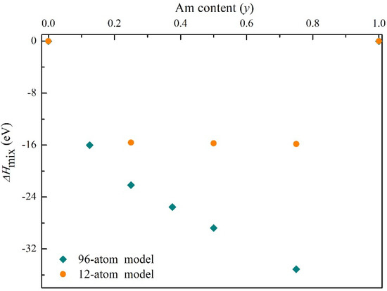- Noutack, M.S.T.; Jomard, G.; Freyss, M.; Geneste, G. Structural, electronic and energetic properties of uranium-americium mixed oxides U1-yAmyO2 using DFT + U calculations. J. Phys. Condens. Mat. 2019, 31, 485501. [Google Scholar] [CrossRef]