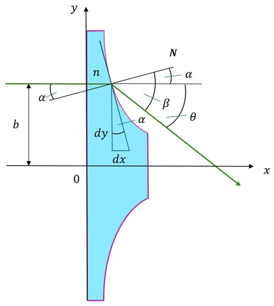 The shape of a lens that provides a specified refraction law , where y is the parameter that associated to the impact parameter b. For simplicity, one of the lens surfaces is made flat, allowing rays traveling parallel to the x-axis to pass through the entry surface without deviation. The shape of the refracting (exit) surface is determined based on Snell’s law: , where the angles and are measured relative to the surface normal N. Given that and , the wanted equation for the surface can be obtained as