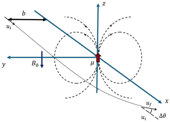 In further calculations, we consider the background magnetic field caused by a magnetic dipole. We focus on a simplified case when the light ray travels through the equatorial plane of the magnetic dipole, as illustrated in Figure 3.