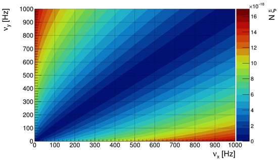 Figure 1 shows a two-dimensional plot depicting the amplitude of , i.e., , as a function of the confinement frequencies and , with s denoting the angular frequencies in the -plane. Figure 1 is obtained given a condensate consisting of non-interacting 87Rb atoms and keeping constant the values of , and . Figure 1 shows how the phase amplitude induced by the GW and enhanced by the number of particles can reach the magnitude of , if the confinement frequencies perpendicular to the propagation direction of the wave are appropriately chosen. This order of magnitude also confirms the approximation made by expanding the time evolution operator in a series. It is also of importance to stress that the amplitude of is independent of both the GW frequency and the confinement frequency along the z direction, since the exponential term in Equation (25) is close to 1. Any significant damping effect on the amplitude can only be observable for values of .