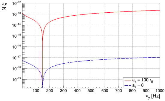 Figure 2 shows the amplitude of , for a condensate of interacting (red line) and non-interacting (blue line) 87Rb atoms, as a function of the confinement frequency along the y axis. Assuming a value of for the GW and , the amplitude of the interacting BEC is of the order of , which, in this case, also confirms the approximation made by expanding the time evolution operator in a series. For typical values of the scattering length of 87Rb, i.e., around (with the Bohr radius), the amplitude is four orders grater than that related to the non-interacting BEC. This suggests that condensates of interacting atoms are preferable over the latter for future GW detection.