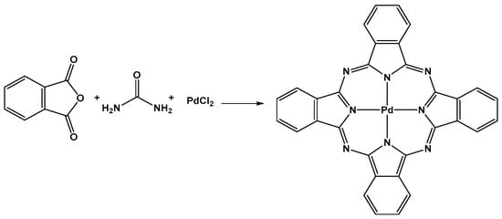 To prepare palladium phthalocyanine (PdPc), the following substances were ground to a homogenous powder: urea (92 mmol, 5.55 g), ammonium chloride (17 mmol, 0.92 g), ammonium molybdate (4.2  10−3 mmol,  g), phthalic anhydride (18 mmol, 2.65 g), and palladium chloride (0.6 mmol, 0.108 g). The mixture underwent fusion for 45 min at 180 °C, and then was cooled to room temperature and washed with 250 mL of boiling water. The product was further purified via recrystallization from a concentrated H2SO4 before drying and washing with boiling acetone [,]. The schematic diagram of synthetic palladium phthalocyanine is illustrated in Figure 1.
