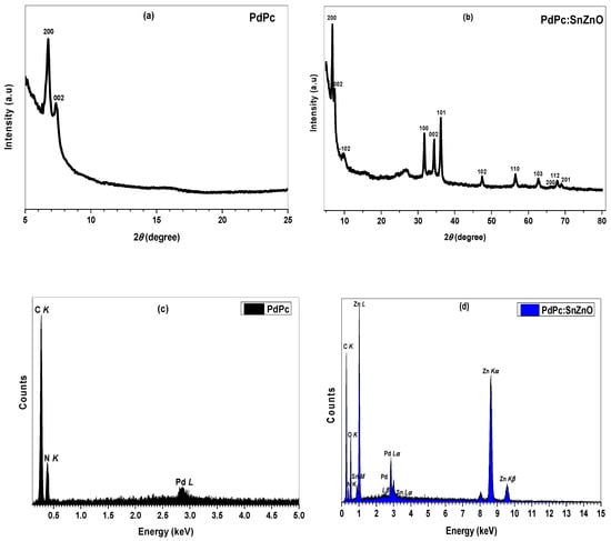 XRD pattern (a,b) and EDX spectrum (c,d) of PdPc compound and PdPc:SnZnO nanohybrid with 0.1% error in the peak position. See text for details.