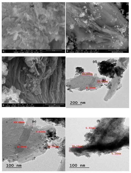 Figure 3d–f describes the TEM images of the nanohybrid. Figure 3d,e shows the aggregation of nanofibers in sheet-like structures decorated with nanospheres, revealing quite a large specific surface area-to-volume ratio. Little NFs were aggregated in nanorods covered with tiny spheres with an average size of about 10 nm [,]. The nanohybrid with a large enough aspect ratio, surface area, and quite high porosity provides plenty of active sites that are exceptionally useful in optoelectronic and solar systems.