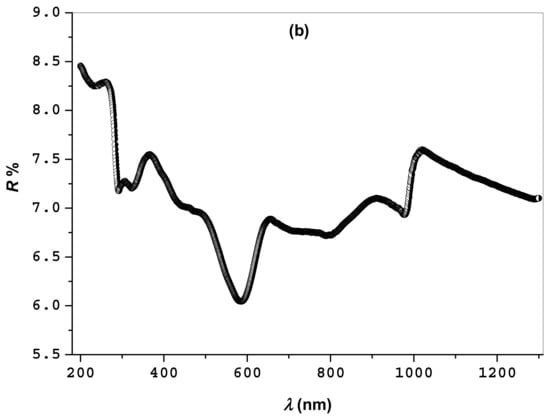 Figure 4 depicts the transmittance and reflectance spectra of the PdPc:SnZnO thin film within a wavelength range of 200 nm–1300 nm. The film exhibits two sharp absorption edges around about 400 nm and 700 nm, associated with the Soret band (B-band) and the Q-band, respectively. These features are attributed to electron transitions from the valence band (V.B.) to the conduction band (C.B.), as illustrated in Figure 4a []. To confirm the weak peaks located at 330 and 385 nm in the UV region, the transmittance spectrum for multiple films was measured through the wavelength range of 200 nm–400 nm, as presented in Figure S1a,b (see Supplementary Materials). These weak peaks may be owing to the presence of SnZnO NPs in the PdPc framework. According to several studies, the intense absorption edge of both undoped and metal-doped ZnO can be observed within the UV region or close to the Vis spectrum at wavelengths ranging from 360 nm 400 nm [,].