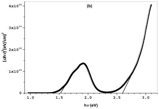 where  is an independent constant and δ is an index of 1/2 for direct allowed transitions. The optical band gap of the hybrid thin film was estimated by extrapolating the straight-line portion of the curve to  as shown in Figure 5b.  was found to be 1.52 eV and 2.60 eV due to the coupling of Frenkel excitons between non-equivalent molecules in a unit cell and  pairs [].