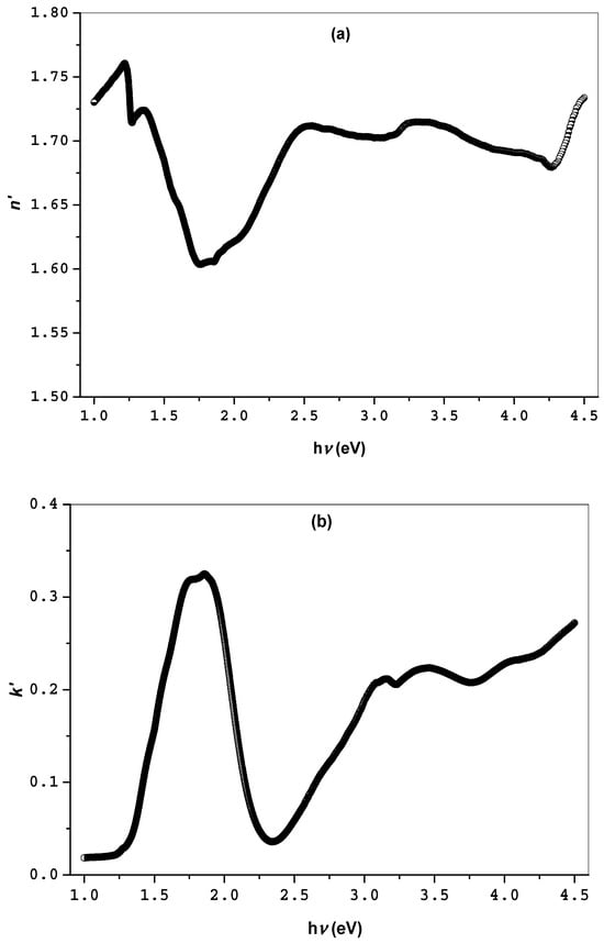 The refractive index as a function of photon energy is depicted in Figure 6a. The thin film exhibits anomalous dispersion arising from optical absorption and strong photon–electron interactions. Two dispersion peaks are noted near the absorption edge (Soret and Q-bands), which are attributed to the absorption of photon energy over a wide range of wavelengths and electronic transitions. The extinction coefficient displayed a wide band in the energy range from 1.71 1.92  within the visible region, as shown in Figure 6b, which is associated with the strong absorption of photon energy by the hybrid thin film, leading to the production of additional free charge carriers [].