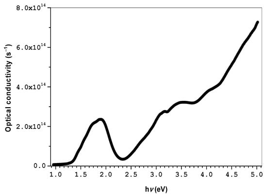 Figure 8 shows the  of PdPc:SnZnO thin film as a function of h. The nanohybrid exhibits high optical conductivity, with the highest values observed in the UV spectrum, along with two bands in the Vis region near the interband transitions, indicating the high enough ability of the nanocomposite to absorb light energy and convert it into charge carriers. In addition, the strong optical conductivity is related to rapid exciton dissociation and free  mobility [].