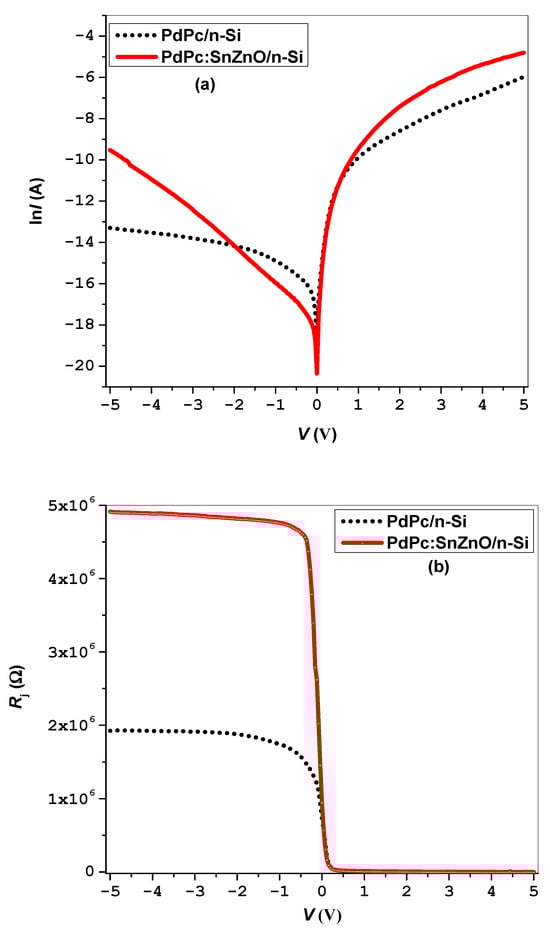 The semilogarithmic I–V dependence of Al/n-Si/PdPc/Ag and Al/n-Si/PdPc:SnZnO/Ag Schottky diodes were measured in dark conditions over a voltage range of −5  to +5 . The devices exhibited nonlinear rectifying behavior, with rectification ratios   899 and 496 at +3 V, and −3 V respectively, as illustrated in Figure 9a. Here Ir and If are the reverse and forward currents, respectively. The hybrid photodiode revealed a higher rectification ratio attributed to the presence of SnZnO dopants in the PdPc, which produced excess donor electrons. The incorporation of the stannic ion (Sn4+) increased carrier density by providing two additional free electrons []. To evaluate the performance of photodiodes, electronic parameters such as the potential barrier , saturation current , ideality factor , shunt resistance , and series resistance  were defined using the thermionic emission (TE) theory, Cheung–Cheung, and Norde functions.