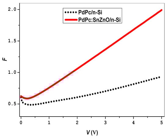 In Equations (13) and (14),  represents the effective metal contact area of  and  is the effective Richardson’s constant of  for n-type Si. Both photodiodes displayed a low saturation current, suggesting a minimum leakage current and minority carrier diffusion, whereas the hybrid PdPc:SnZnO/n-Si diode’s low enough potential barrier emphasized quite rapid majority carrier transfer to metal contacts [,]. It is known that the critical voltage or barrier height of the stannic zinc oxide as a metal oxide semiconductor material typically ranges between 0.2 eV and 0.8 eV, depending on the type of metal doping support and its concentration, as well as the metal contacts used in Schottky photodiodes. The ideality factor ais one of the key parameters for describing device quality. At a relatively low voltage, the ideality factor was calculated from the slope of lnI–V using the following equation: