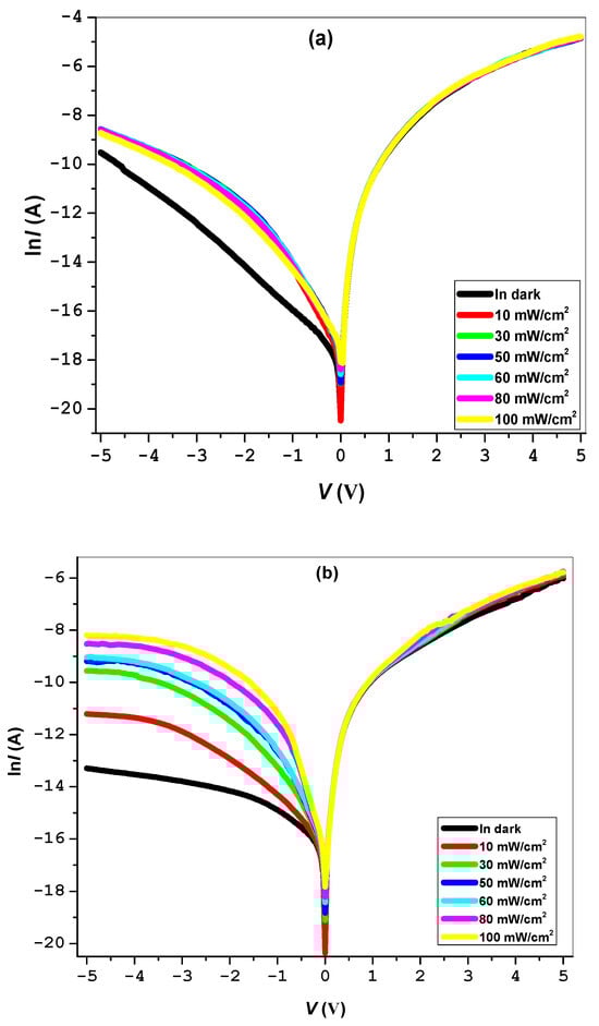 The photosensitivity and current transfer mechanisms were investigated under different illuminations. The undoped photodiodes exhibited a lower photocurrent (Figure 13a) compared to the hybrid photodiode, which increased from 10  in the dark to 2  under a light intensity of 100 mW/cm2 (Figure 13b). PdPc:SnZnO acts as a photoactive layer, capturing more photons and improving light absorption. When the photodiode is subjected to light, the trapped centers at the heterojunction layers absorb the incident photon energy and jump to the conduction band []. In addition, the morphological and topological architecture of the nanofibers with higher surface porosity and a larger aspect ratio enhances the light trapping on the surface and increases the ability of the photodiode to absorb excess photon energy, resulting in a great efficient conversion of light energy into electrical signals. The current transport mechanism at the interface was defined from the power law