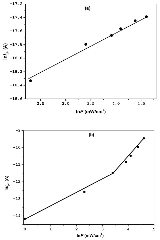 Here,  denotes the photocurrent, P denotes the incident power of the UV light intensity,  is an exponent that determines the dominant charge mechanism, and B is a constant. The exponent m of an undoped diode was found by linear fit (Figure 14a) to be 0.41 ± 0.02 with a coefficient of determination (R2) = 0.99, which indicates an acceptable fit. suggesting that the recombination effect dominates the current generation process. On the other hand, the hybrid diode shows different behavior. As shown in Figure 14b, there are two linear regions, namely 0.5 V to 3.4 V and 3.4 V to 4.6 V (taken at  with slopes of 0.78 ± 0.08 and 1.67 ± 012, with R2 = 0.99, and 0.98 respectively, which provide an acceptable fit. The exponent 0.78 indicates that the dominant transport mechanism is the trapped charge carriers at deep levels, while 1.67 confirms that the free space charge limited current improves photoconductivity []. The hybrid Schottky diode displays two distinct current transport mechanisms based on the charge carrier density accumulated at different heterojunctions of the PdPc:SnZnO semiconductor, with the current increasing as the voltage increases, resulting in excess carrier injection.