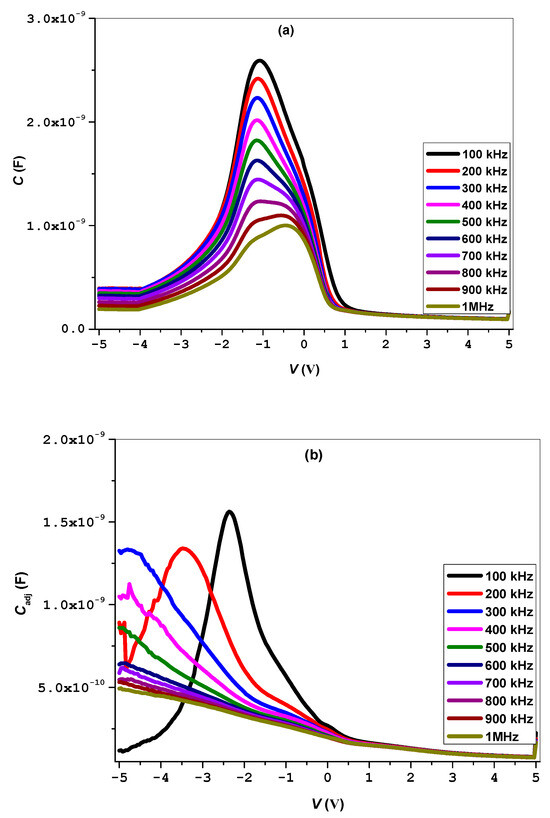 The junction behavior of the Al/n-Si/PdPc:SnZnO/Ag diode was studied as a function of voltage and frequency. Figure 15a,b shows the measured capacitance–voltage (CmV) and adjusted (corrected) capacitance–voltage (Cadj–V) for different frequency ranges within 10 kHz–1 MHz interval. The capacity peak gradually decreased from 6.42  to 0.56  as the applied frequency was shifted to lower reverse bias, and there was no response to alternating current (ac) signals at a positive voltage (Figure 15a). At lower frequencies, the trapped charge carriers at the interfacial layers follow the ac signals, producing additional capacity while responding slowly to higher signals and, thus, contributing less to capacitance. The capacity was corrected considering the impact of series resistance using the following relationship: