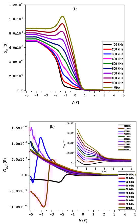 Figure 16a,b shows that the measured  and adjusted  conductance increased with applied frequency at a low voltage bias ranging from  and from , respectively, indicating an increase in charge carrier transitions to metal contacts. The width of the  peak decreased and shifted to a lower voltage, attributed to the higher response of interface states to ac signals (Figure 16a). The fluctuations in  behavior at higher reverse bias can be linked to the higher impact of interface states and series resistance (Figure 16b).