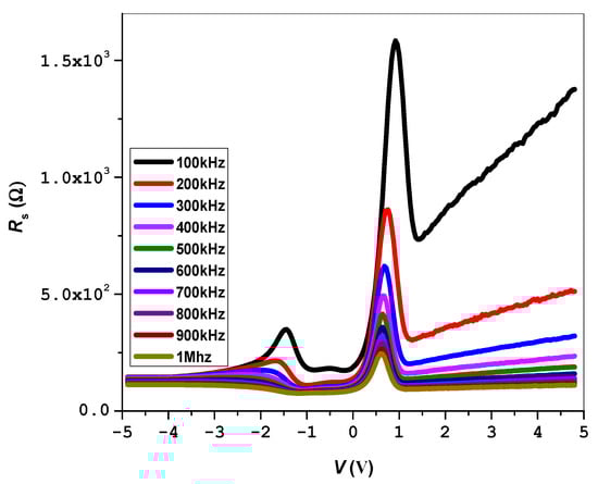 Rs–V dependence of Al/n-Si/PdPc:SnZnO/Ag diode for various alternative current frequency ranges, as indicated. See text for details.