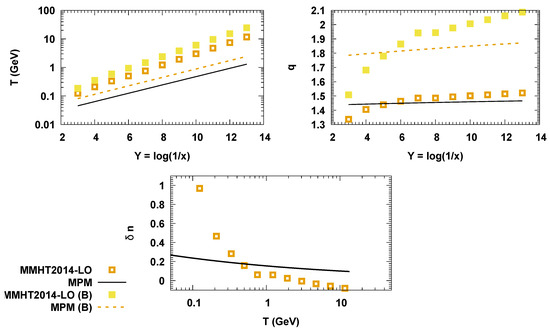 Figure 2 compares the collinear PDF extrapolated model (open squares) with the MPM scaling curve (solid lines) for the temperature parameters T and the indices q and as a function of . These quantities are defined in Equations (6) and (7). First, the temperature growth is approximated by a power law as a function of rapidity. However, the predicted behavior from the collinear PDF toward large rapidity is much faster compared to that of the MPM scaling, where . The non-extensive index q obtained from the relations (6) shows much faster growth towards its leading-order value .