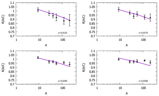 For higher values of x, there is a slightly larger suppression than that one observes in the data, since the tin nucleus, like lead, has a large number of nucleons, . This effect is better present in Figure 5, where the results of our calculations are compared with the data from Ref. [101] as a function of A. For and , the calculations slightly underestimates the data.