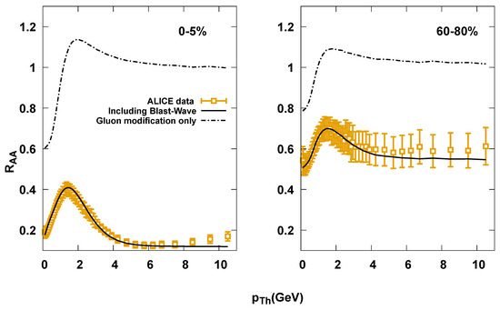 Figure 6 illustrates the nuclear modification factor for two distict centralities (most central and peripheral collision samples) as a function of the transverse momentum of the charged pions produced at TeV [108]. One can observe a suppression at low followed by an increase near resembling the behavior of UGD. Multiple interactions produces a Cronin-like peak as a result of increasing parton transverse momentum . In central collisions, where the hot medium modifications are expected to be of higher importance, the suppression is larger than predicted by UGD modification (dotted–dashed lines). On the other hand, in peripheral collisions, the difference becomes smaller. To overcome this limitation, see Refs. [29,30]. Let us use a modified UGD calculation as the initial particle distribution function in the Boltzmann transport equation (BTE) in the relaxation time approximation (RTA):